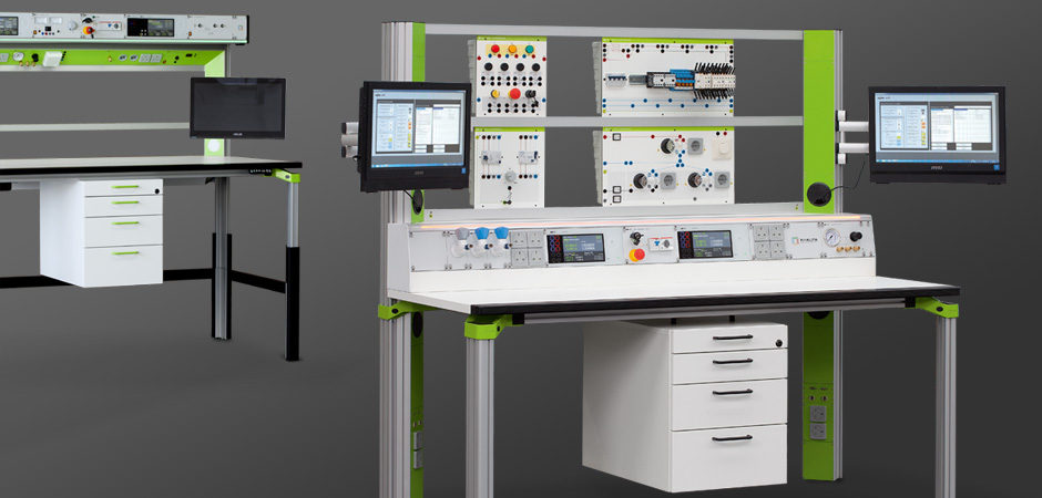 All desks are equipped with the sensor-controlled RGB LED workstation lights developed by erfi and the RGB LED indication light. The tables are double-equipped and can be used by two students. In addition to the laboratory furniture and test equipment, “all-in-one PCs” were also installed. The table system and the entire seating was designed in ESD and thus complies with the electronics laboratory standards.